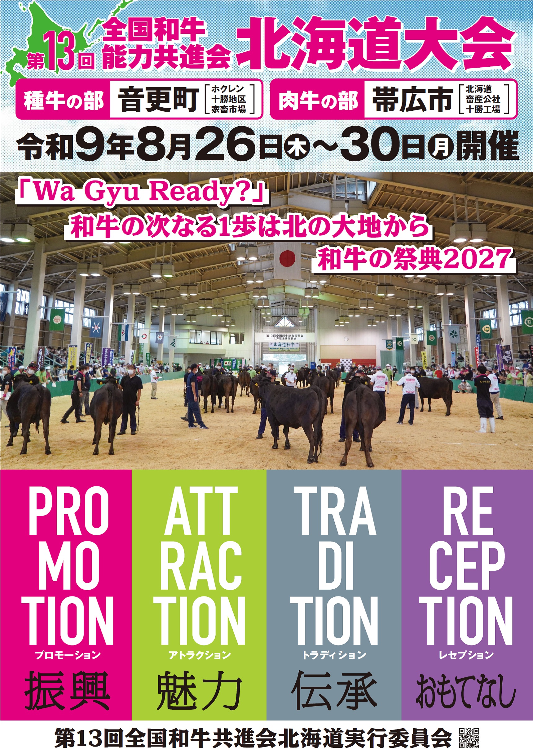 大会のイベントテーマ「Wa Gyu Ready? 和牛の次なる1歩は北の大地から 和牛の祭典 2027」や期間・場所が掲載された新ポスターが完成しました。道内外の多くの皆様に本大会を知っていただけるよう引き続き積極的に情報発信を行ってまいります。