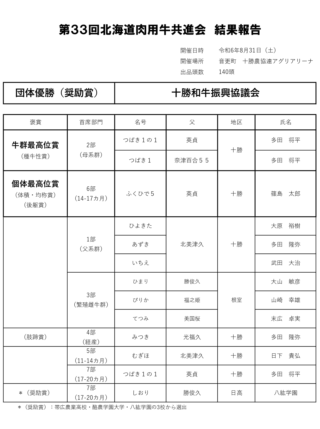 ホクレン主催の同共進会が、第13回全共北海道大会種牛の部と同会場の十勝農協連アグリアリーナ(音更町)で開催され、7部門中6部門の首席を十勝地区が獲得し、地区団体表彰(北海道和牛振興業議会付帯行事)は、十勝和牛振興協議会が受賞しました。