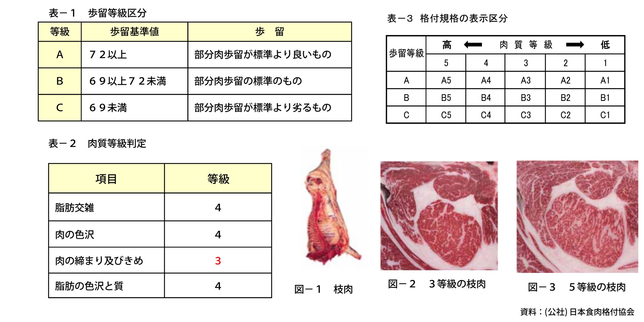 格付は、「枝肉」の「歩留等級(A~C)」と「肉質等級(5~1)」の組み合わせで決まり、「肉質等級」は、脂肪交雑などの4項目を判定し、最も低い等級とされます。歩留が良く肉質等級が最も高いものが「A5」と格付けされます。